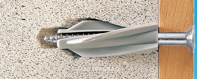 Сформировать разъемное соединение в рамках газобетонного блока поможет профильный дюбель. Изделие является полимерной распоркой с четырьмя смещенными лепестками. Они взаимодействуют с неровностями посадочного отверстия, препятствуя извлечению крепежа. Продукция не повреждает пористое основание, обладает высокой прочностью.