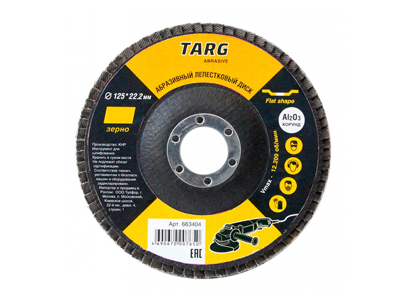 Круг лепестковый абразивный "Targ" имеет веерообразное, радиальноме размещение пластинок из абразивной шкурки на тканевой основе.
