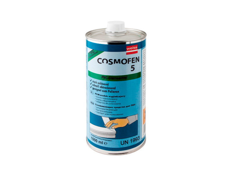 Очиститель COSMOFEN 5 – сильнодействующий растворитель в линейке специальных средств для очищения ПВХ-материалов от COSMOFEN.